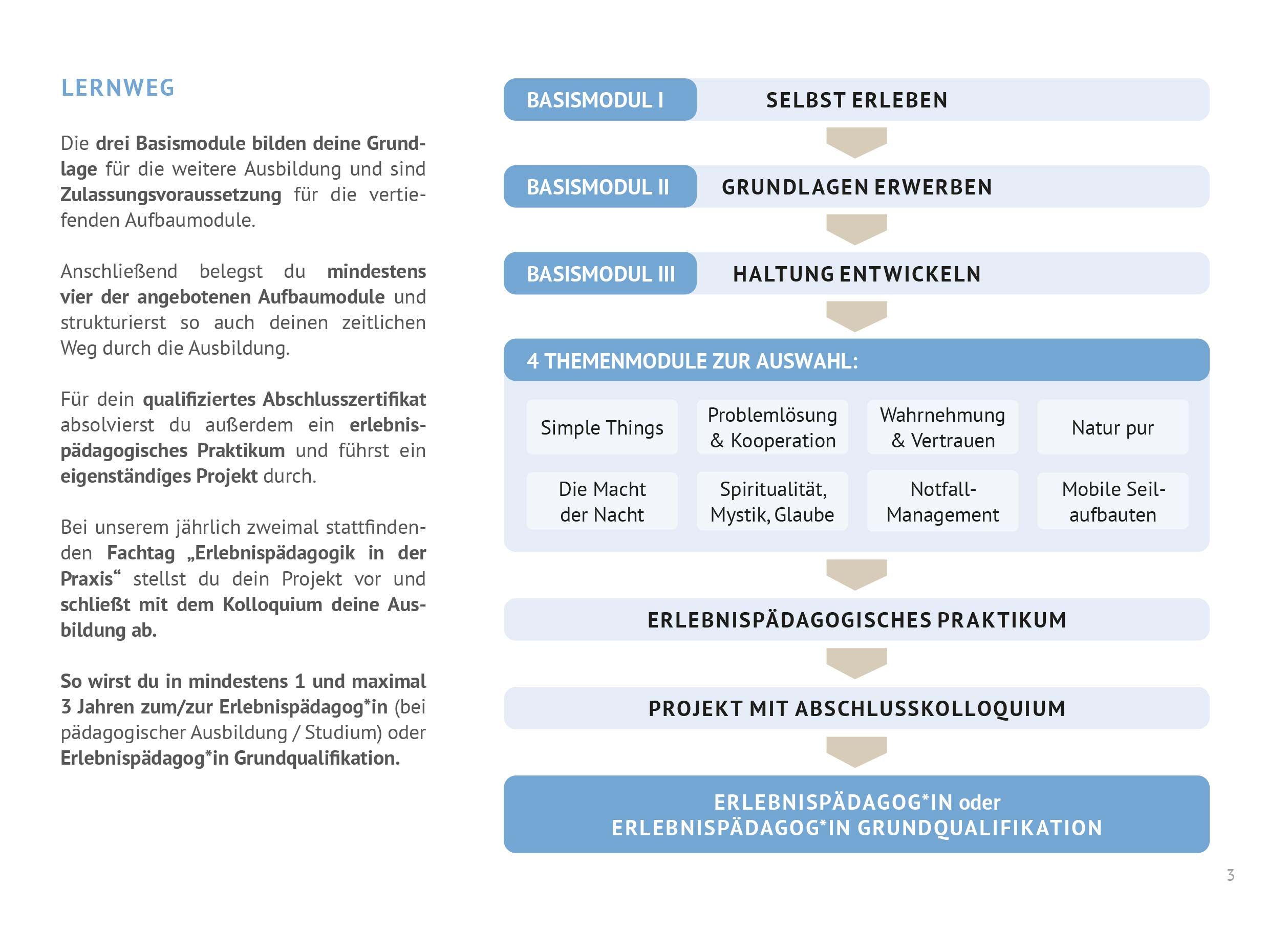 - einen Nachweis über ein erlebnispädagogisches Praktikum (mindestens 20 Stunden).