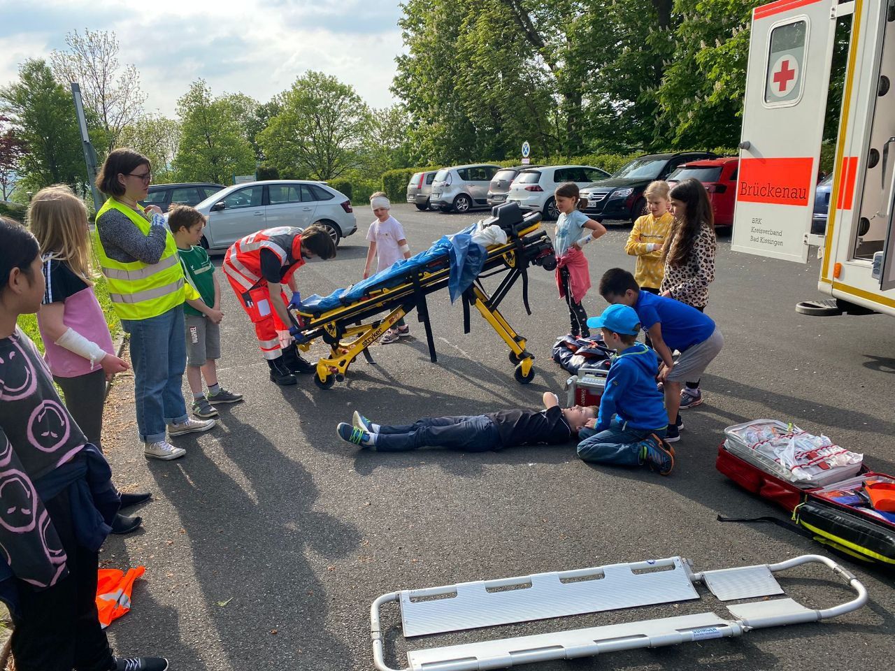 „Am Volkersberg, bei Bad Brückenau. Wenn man den Parkplatz hochfährt, geht es am Kreisel vor dem Eingang links eine Treppe runter, da sieht man uns schon!“ Ein Achtjähriger setzt einen einwandfreien Notruf ab. Am vergangenen Wochenende haben 10 Kinder im Alter von 8-12 Jahren Erste Hilfe gelernt.