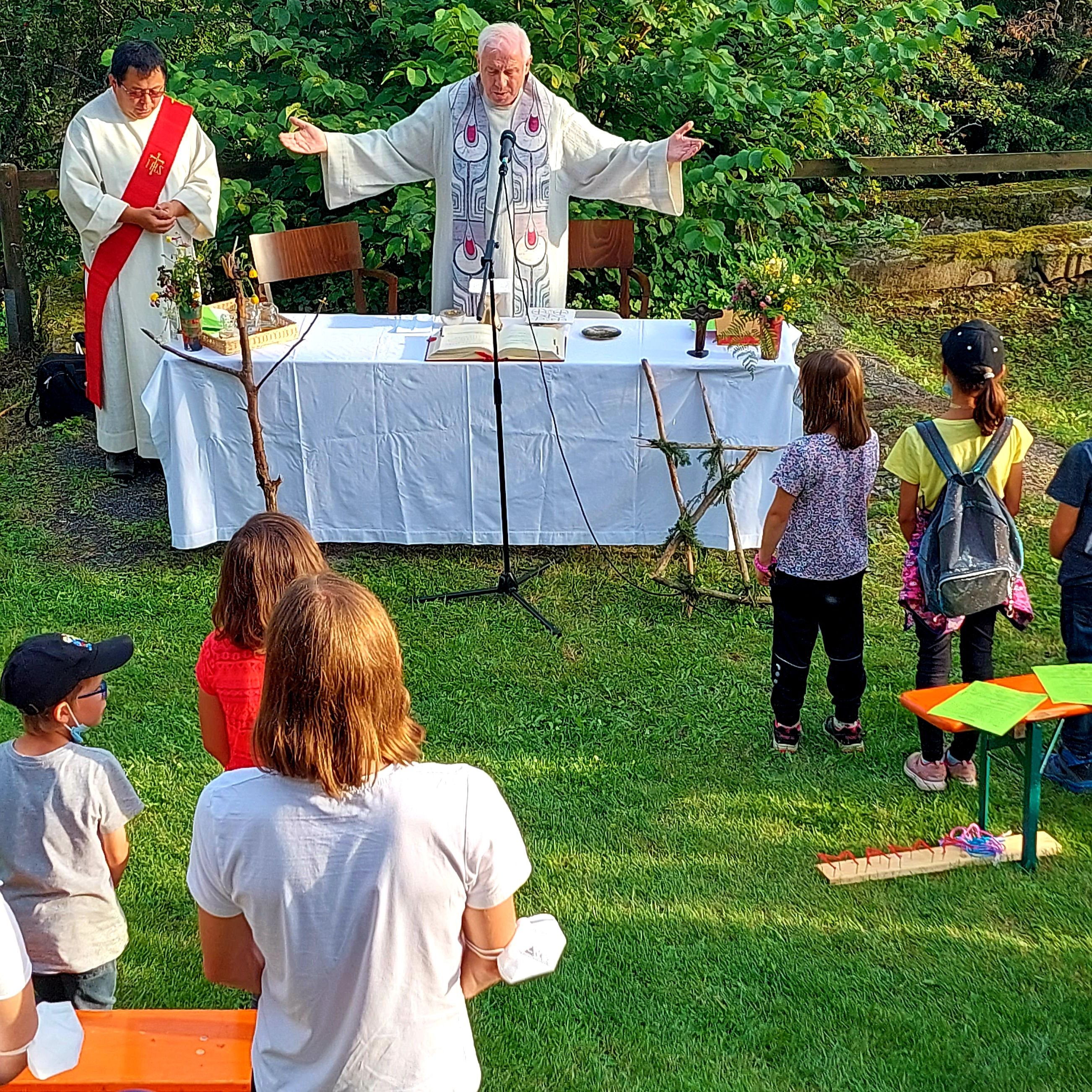 Zum abschließenden Gottesdienst in den Terrassengärten mit dem ehemaligen Volkersbergrektor Pfarrer Edwin Erhard kamen rund 30 Eltern dazu. Hier wurde deutlich, dass sich die jugendlichen Gipfelstürmer in guter Gesellschaft befinden. Schon seit Jahrhunderten kommen die Menschen auf ihren Volkersberg, um in der Wallfahrtskirche Sorgen, Anliegen und Nöte vor das heilige Kreuz zu bringen und so gestärkt in den Alltag zurückzukehren. Die Kinder und Jugendlichen folgten also den Spuren der Pilger und Wallfahrer früherer Zeiten und füllten diese mit neuem Leben: Auch sie kamen zu Fuß, erlebten einen ereignisreichen Tag und konnten nochmal Kraft tanken, bevor am nächsten Tag das neue Schuljahr startete.