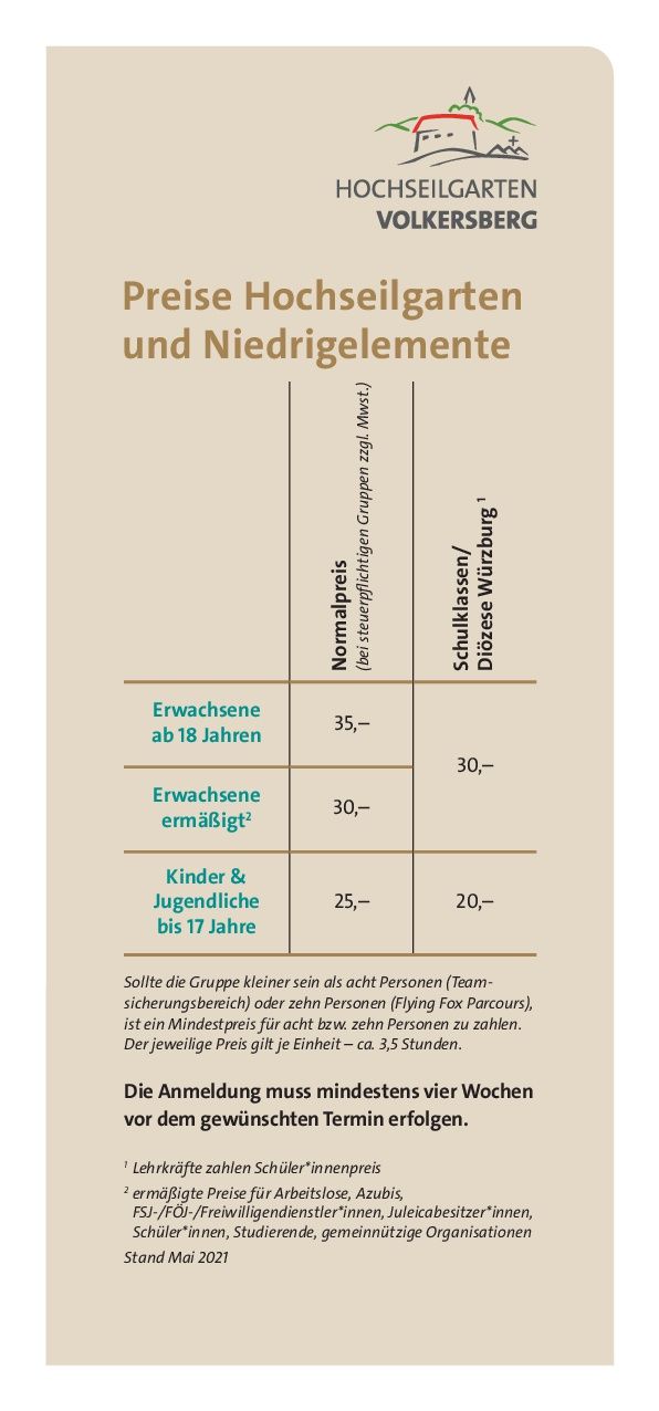 In diesen Preisen enthalten sind das Hochseilgartentraining inkl. Helm- und Gurtzeug sowie die Begleitung durch ausgebildete und erfahrene Trainer*innen. Gerne erstellen wir Ihnen auf Anfrage ein individuelles Angebot für Team- und Führungstrainings oder Events mit weiteren Outdoor-Elementen.